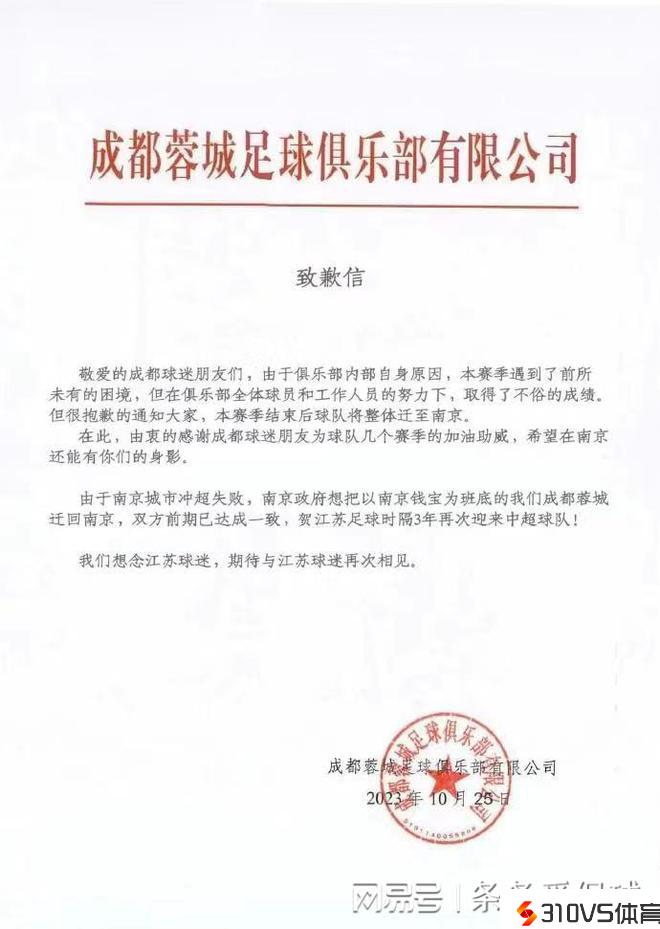 据悉,由于南京城市冲超失败,南京政府希望以南京钱宝为班底的蓉城迁回南京,双方前期达成分歧,江苏足球时隔3年再次迎来中超球队。但很快记者王明浩便晒出了一封抱歉信:内容为成都蓉城本赛季因俱乐部自身缘由遇到困境,但球队依然取得不俗效果,但本赛季完毕后球队将全体迁至南京。对此,王明浩写道:“Fakenews(假旧事)太假了!”由此可以看出,关于成都蓉城下赛季撤离成都,将主场迁至南京的音讯并不失实。下赛季成都蓉城和四川九牛的四川德比有望如期停止。