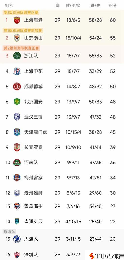 中超最新积分榜:海港夺冠山东第二,成都3-2绝杀国安