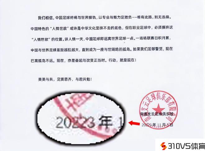 原来,就在南通支云贺信第二页的右下角盖章处,签发日期赫然写着:“20223年11月3日”(下图)。广阔球迷万万没想到,这居然是一封来自1万8千年后收回来的贺电。假设不是穿越,这家于1万8千年后的“南通支云足球俱乐部”是怎样知道2023年有一支叫上海海港的中超球队夺冠呢?