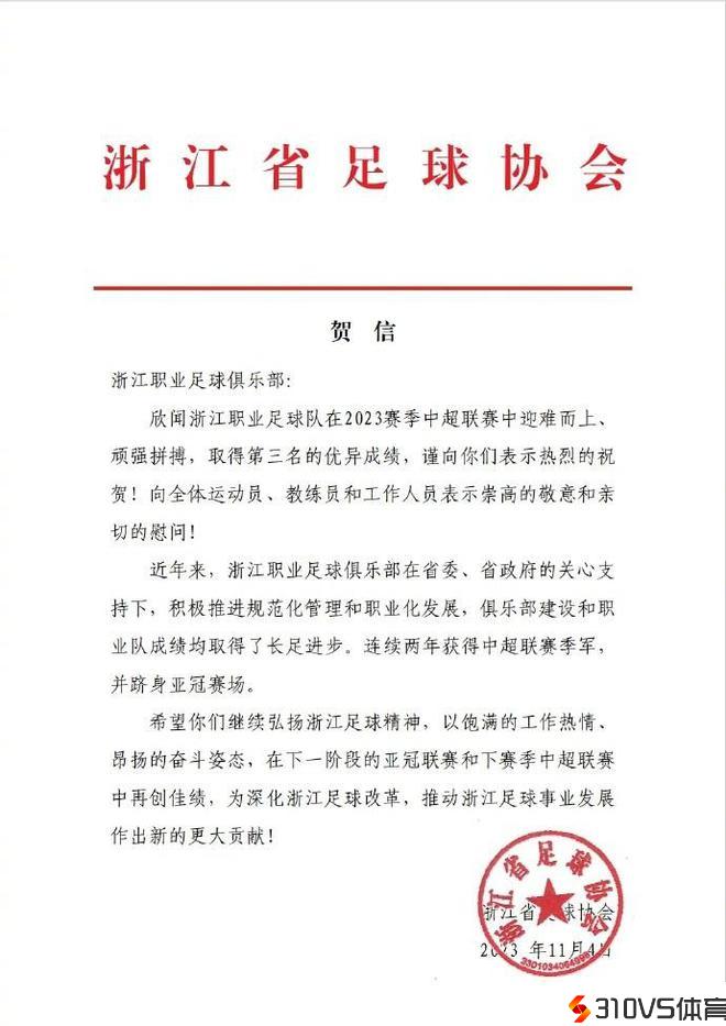 欣闻浙江职业足球队在2023赛季中超联赛中迎难而上、顽强拼搏,取得第三名的优秀效果,谨向你们表示热烈的祝贺!向全体运发动、教练员和任务人员表示高尚的敬意和亲切的慰劳!