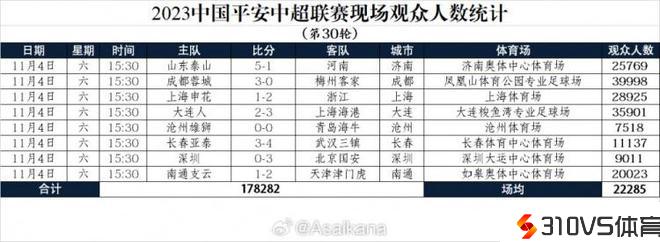 中超第30轮观众人数统计:蓉城主场超3.9万最多,沧州主场最少