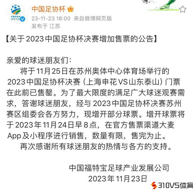 抓住最后抢票时机!足协杯决赛一票难求,大批增票24日8点开售