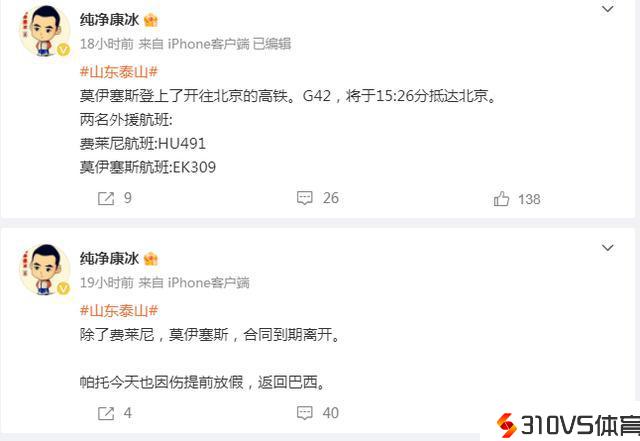 29日,据泰山北京球迷协会会长康冰社媒泄漏,费莱尼已在来京路上,莫伊塞斯也将下午抵达北京。山东名记夏晓司也证明两人的分开,他们将从北京乘坐航班分开。同时球队也在泰山队基地为莫伊赛斯和费莱尼送行,现场球员列队告别,这是对罪人们的最大尊重,未来后会有期。