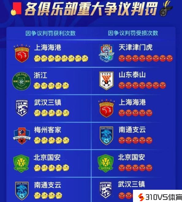 数据不会骗人!本赛季中超联赛上海海港裁判获利8次,泰山队最少
