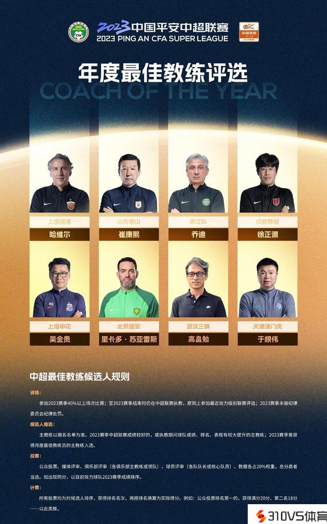 2023赛季中超年度最佳教练候选人包括:中超冠军上海海港队主帅哈维尔、中超亚军山东泰山队主帅崔康熙、中超季军浙江队主帅乔迪、中超第四名成都蓉城主帅徐正源、中超第五名上海申花主教练吴金贵、中超第六名北京国安主帅里卡多-苏亚雷斯、中超第七名武汉三镇主帅高畠勉、中超第八名天津津门虎主帅于根伟。