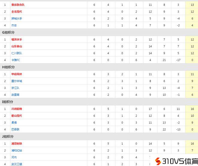 东亚区的球队还是日韩最强,都有3队出线,J联赛球队除了横滨水手晋级,I组的川崎前锋6轮竞赛拿到5胜1平坚持不败,以16分锁定第一晋级;H组的甲府风林末轮3-2力克武里南联,积分下跌到11分,拿到该组第一晋级。曾经3次取得亚冠冠军的浦和红钻,也是卫冕冠军,只以7分排在J组第二,无缘出线。K联赛球队:J组的浦项铁人5胜1平16分第一晋级,I组的蔚山HD3胜1平2负积10分取得了小组第二,F组的全北现代汽车异样是小组第二出线。
