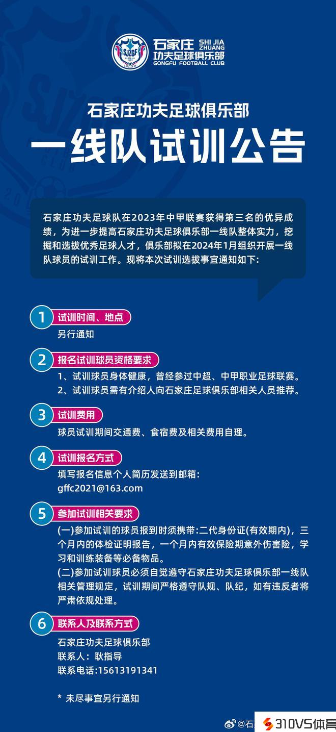 石家庄功夫足球队在2023年中甲联赛取得第三名的优秀效果,为进一步提高石家庄功夫足球俱乐部一线队全体实力,开掘和选拔优秀足球人才,俱乐部拟在2024年1月组织展开一线队球员的试训任务。现将本次试训选拔事宜通知如下: