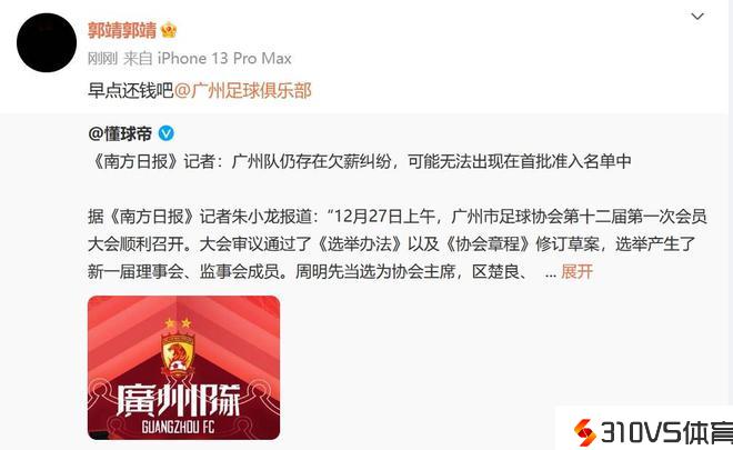 继续讨薪,前广州球员郭靖转发我懂广州队旧事:早点还钱吧
