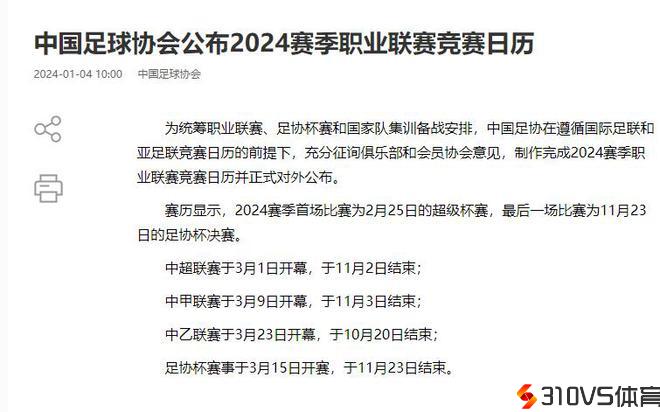 足协发布2024年赛历:中超3月1日开幕,11月2日完毕