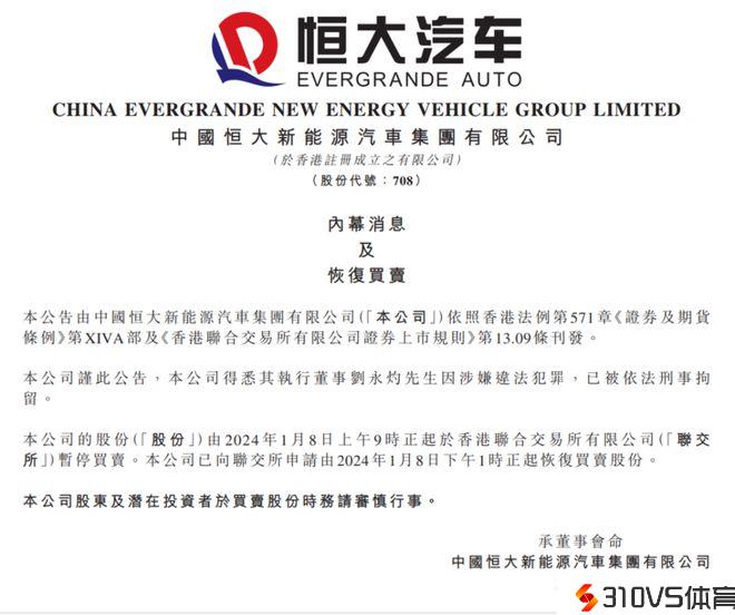 2个月后的2023年9月28日,恒大汽车与中国恒大、恒大物业3家恒大系公司又再次持久停牌。后续,恒大系三家公司停牌缘由揭晓,恒大执行董事及董事会主席许家印,因涉嫌违法立功,已被采取强迫措施。后续,2023年10月9日,恒大汽车恢复买卖本公司股份。