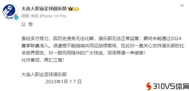 大连人俱乐部在公告中表示,虽经多方努力,因历史债务无法化解,俱乐部无法正常运营,最终未能经过2024赛季联赛准入。很遗憾不能继续共同征战绿茵场,在此对不时关心支持俱乐部的社会各界冤家,对一路风雨陪伴的广阔球迷,深深再道一声感谢!化作春泥,再汇江海!