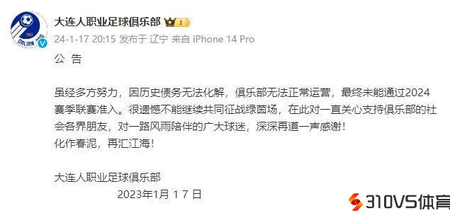 大连人俱乐部官微发布公告,但落款是2023年1月17日。