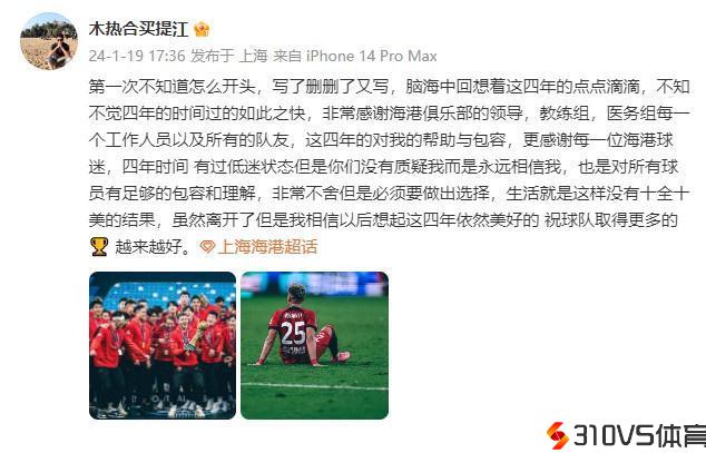 上赛季为海港效能的中场球员买提江在团体社交媒体上宣布将分开球队,并为球队送上了祝愿。