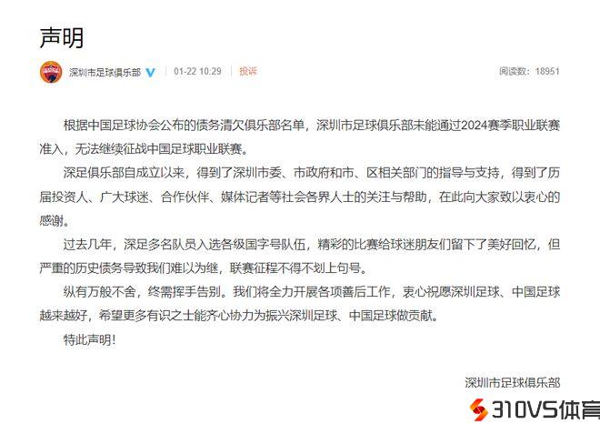 深足在声明中指出,过去几年,球队多人中选各级国字号队伍,精彩的竞赛给球迷留下了美妙回想,但严重的历史债务招致俱乐部难以为继,联赛征程不得不画上句号。
