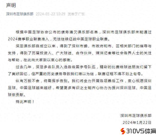 22日,中超元年冠军深圳市足球俱乐部发布声明称,球队因严重历史债务难以为继,联赛征程不得不画上句号。
