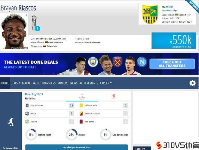 里亚斯科斯的职业生涯数据并不令人印象深入。他在236场竞赛中只打进了57球,近两个赛季更是在42场竞赛中仅打进5球。他的身价,55万欧元,甚至不及中国国度队球员张玉宁的60万欧元,更与武磊的150万欧元相差甚远,与韦世豪和王上源的身价相反。
