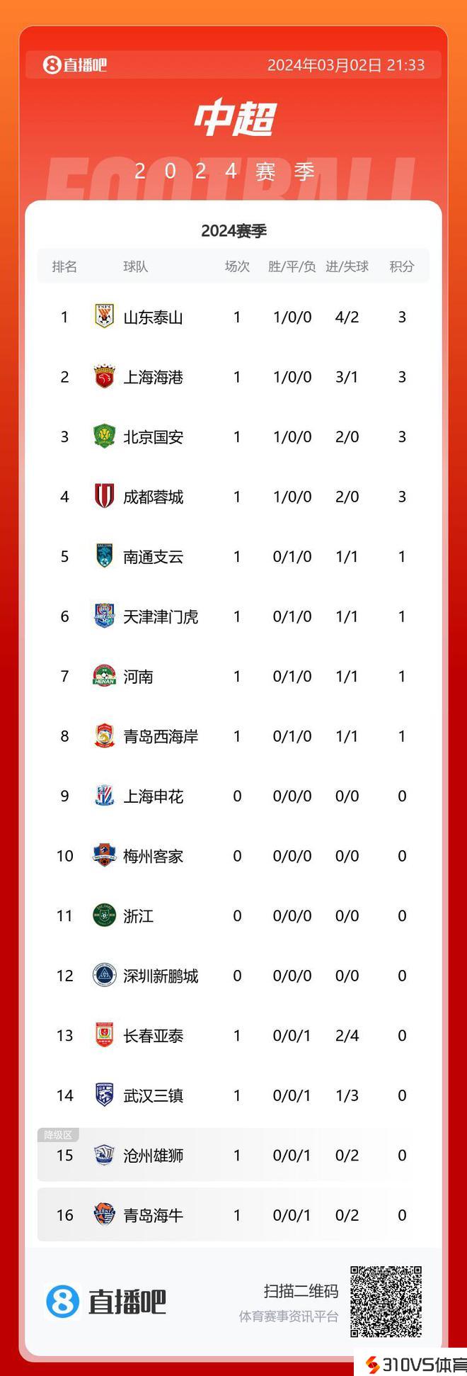 中超积分榜:泰山第一,海港第二,国安、蓉城第三