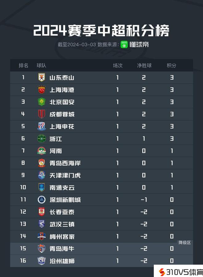 中超首轮积分榜:山东、海港、国安、成都、申花位居前五