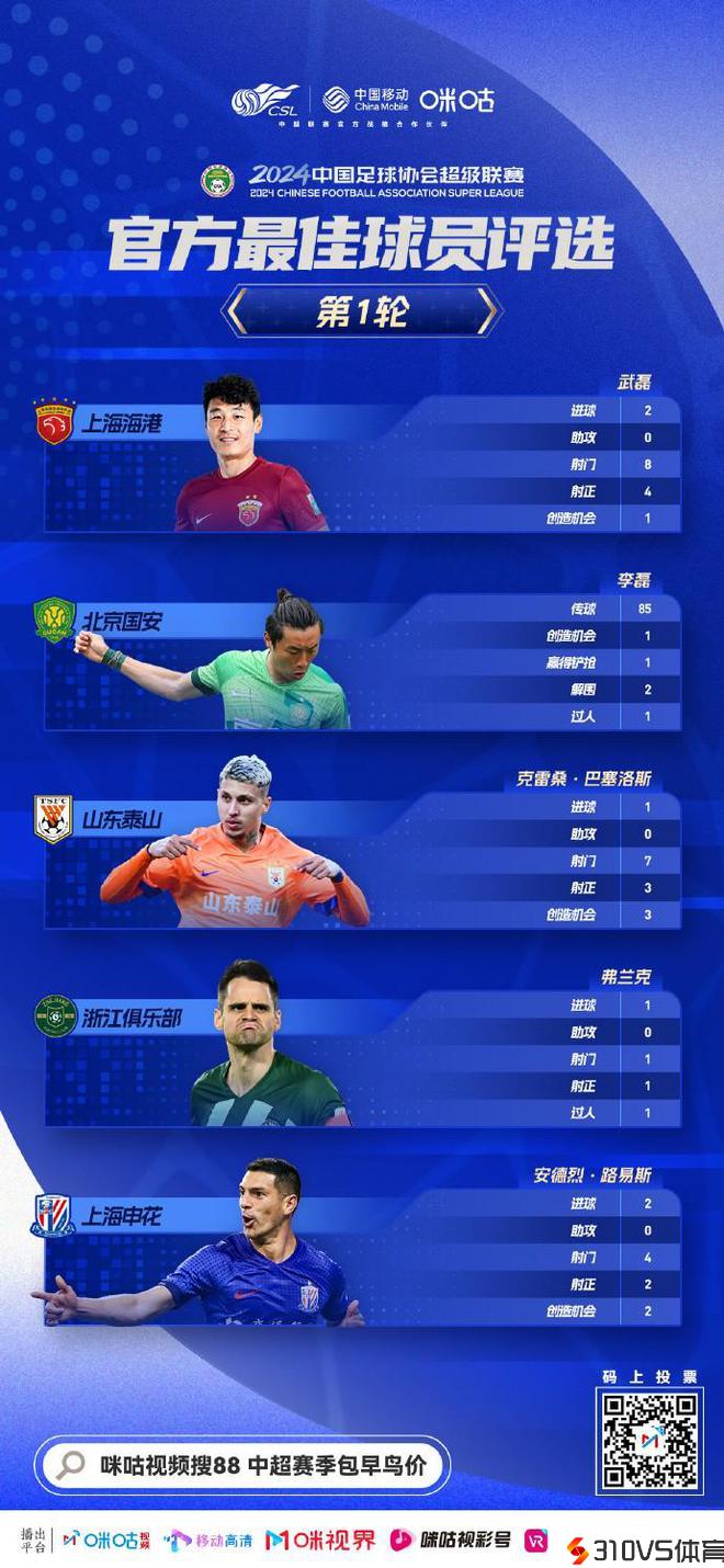 中超首轮官方最佳候选:武磊、克雷桑、弗兰克、李磊、路易斯