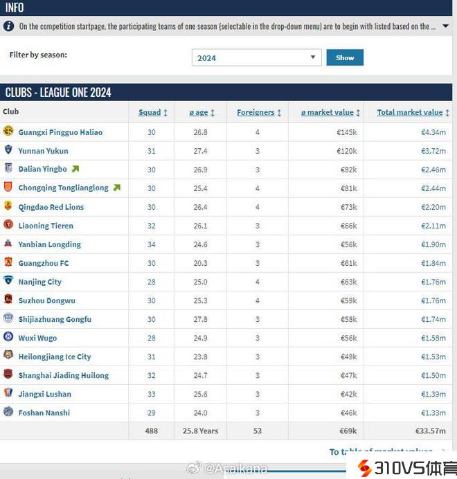 中甲球队德转身价排行:广西队434万欧居首,云南队第二