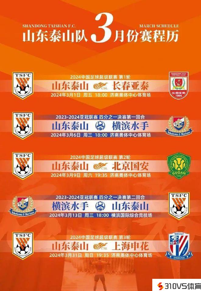 泰山发布3月赛历,亚冠赛前布置确定,伊万现场观战调查泰山国脚