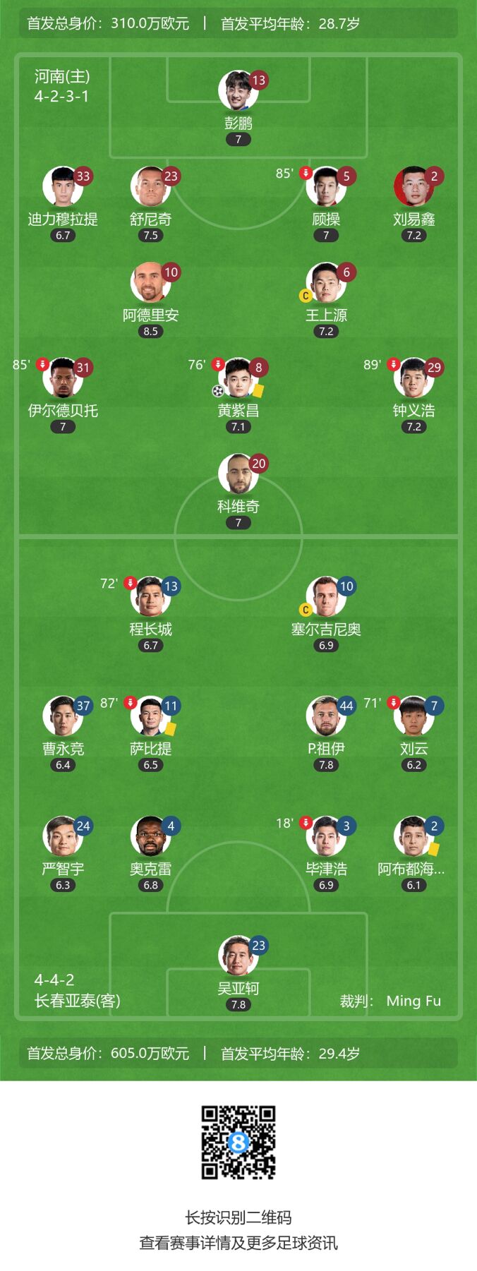 中超-河南1-1长春亚泰 黄紫昌破僵、田玉达替补扳平