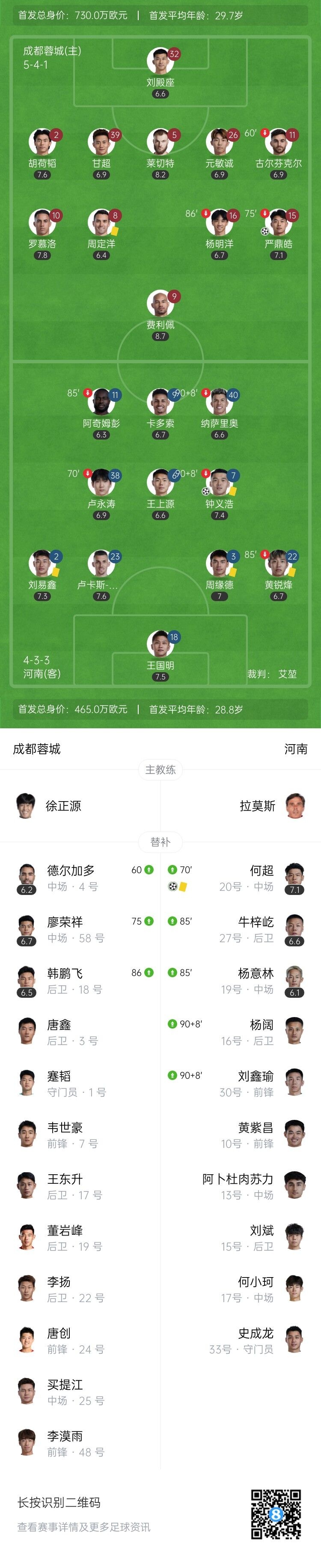 伤停补时13分钟。全场比赛结束,成都蓉城1-2河南。