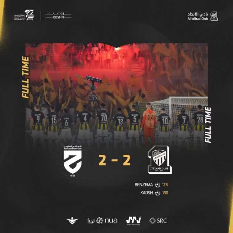 沙特联-四轮不胜!吉达联合2-2遭哈森姆绝平 本泽马传射坎特助攻