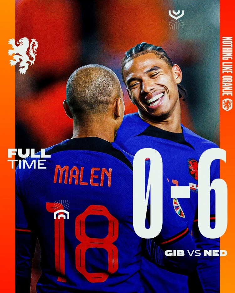 欧预赛-荷兰6-0直布罗陀3连胜收官 斯滕斯戴帽加克波替补建功