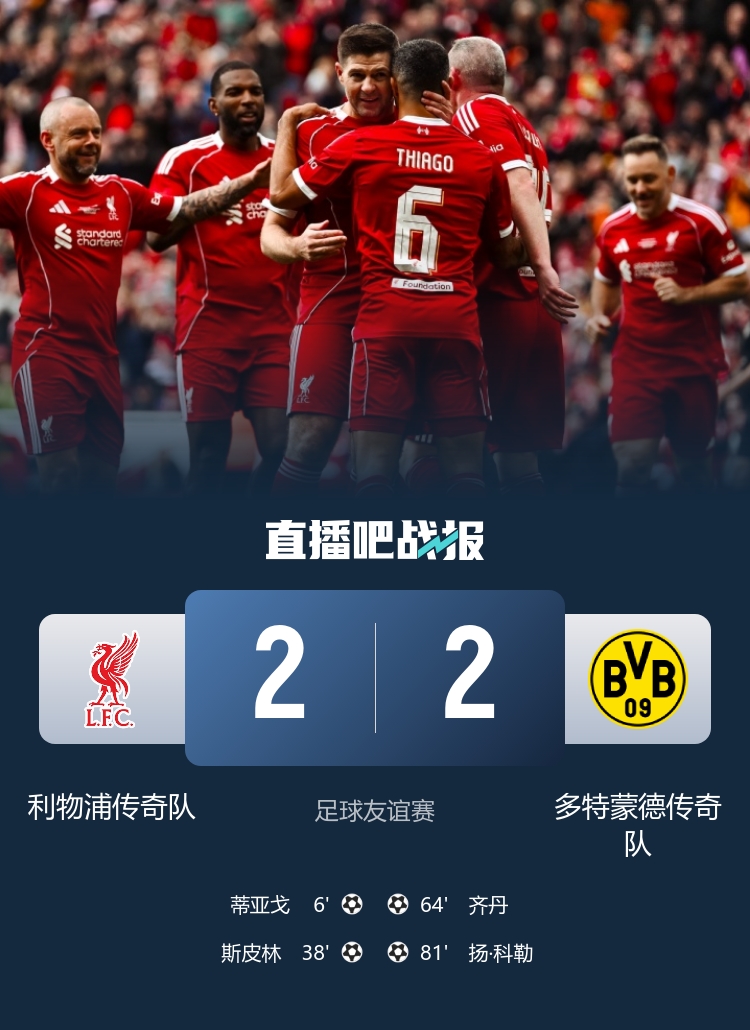 3月28日讯 北京时间3月28日23:00,足球友谊赛利物浦传奇队迎战多特传奇队的比赛在安菲尔德球场进行,上半场巴贝尔助攻蒂亚戈闪击得手,杰拉德失单刀,斯皮林世界波扩大比分,下半场杜尔姆助攻齐丹推射扳回一城,扬·科勒头球扳平,最终利物浦传奇队2-2多特传奇队。
