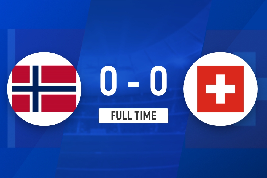 全场比赛结束,挪威0-0瑞士。