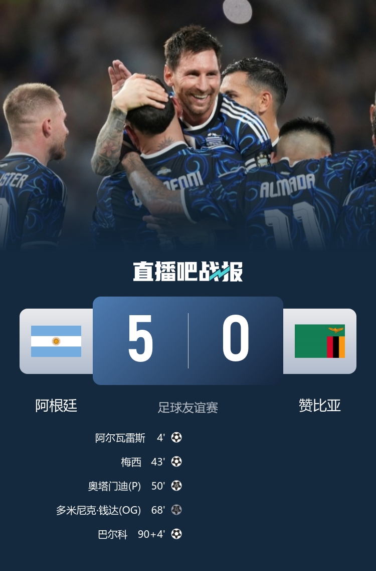 梅西破门+让点奥塔门迪告别战点射 阿根廷5-0赞比亚3月友谊赛两胜
