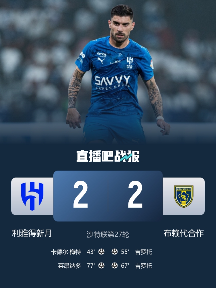3连胜终结!利雅得新月2-2布赖代合作距榜首5分 梅特莱昂纳多破门