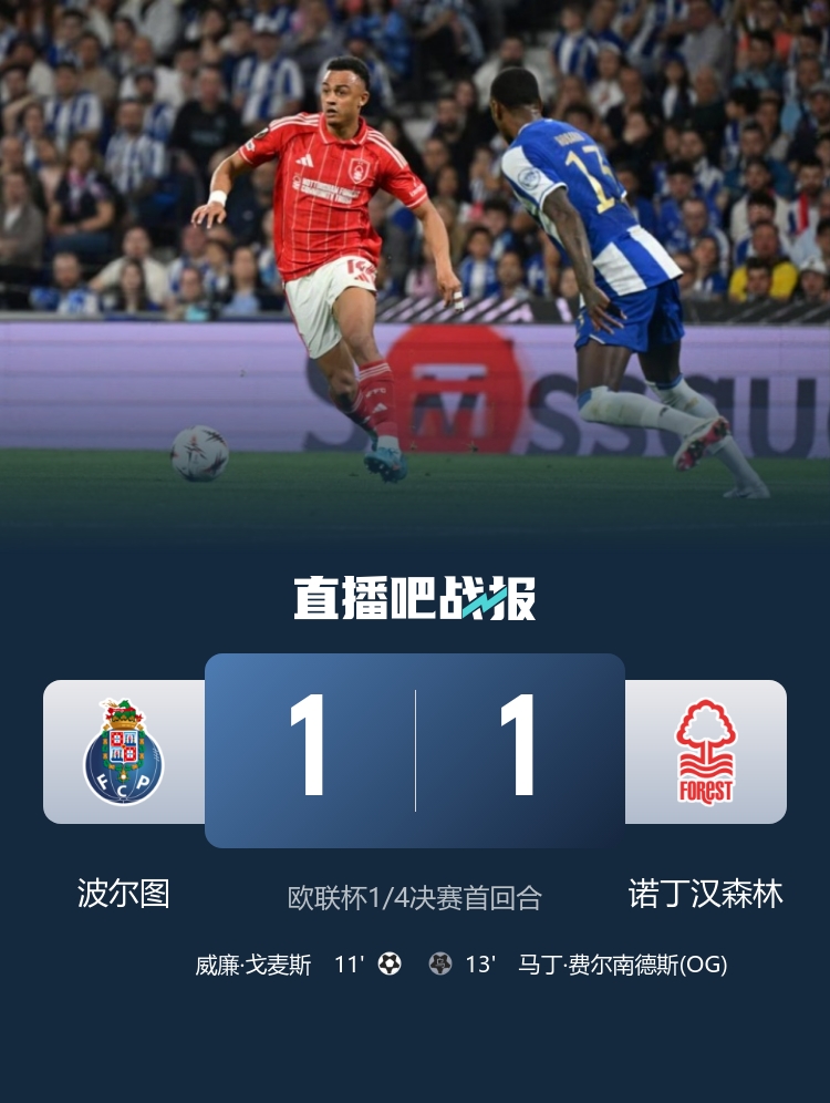 4月10日讯 北京时间4月10日凌晨3:00,欧联杯1/4决赛首回合,波尔图坐镇巨龙球场迎战诺丁汉森林。上半场威廉·戈麦斯破门,马丁·费尔南德斯远距离回传乌龙,波尔图暂1-1诺丁汉森林;下半场伊戈尔·热苏斯进球被吹,最终波尔图1-1诺丁汉森林。