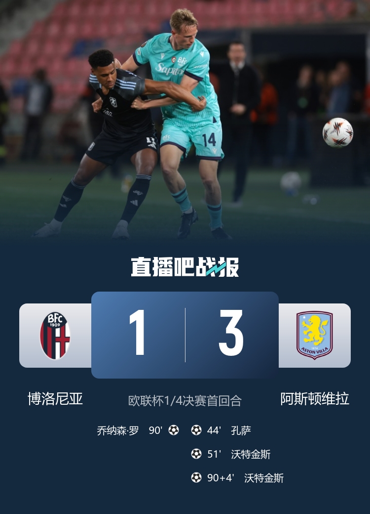 4月10日讯 欧联杯1/4决赛首回合,博洛尼亚坐镇主场雷纳托·达拉拉球场迎战阿斯顿维拉。上半场,博洛尼亚进球被吹,孔萨建功。易边再战,沃特金斯破门+补时完成双响,乔纳森罗扳回一城。最终维拉3-1客胜博洛尼亚占得先机,次回合将于17日凌晨3点移师维拉主场。