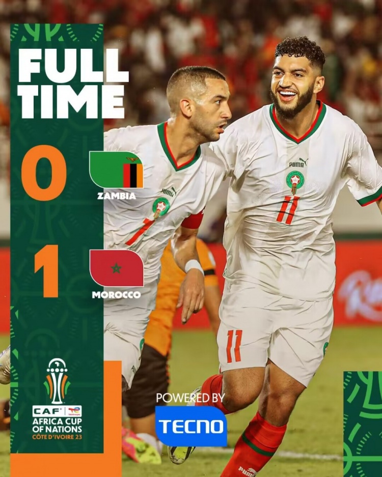 全场比赛结束,摩洛哥1-0赞比亚。