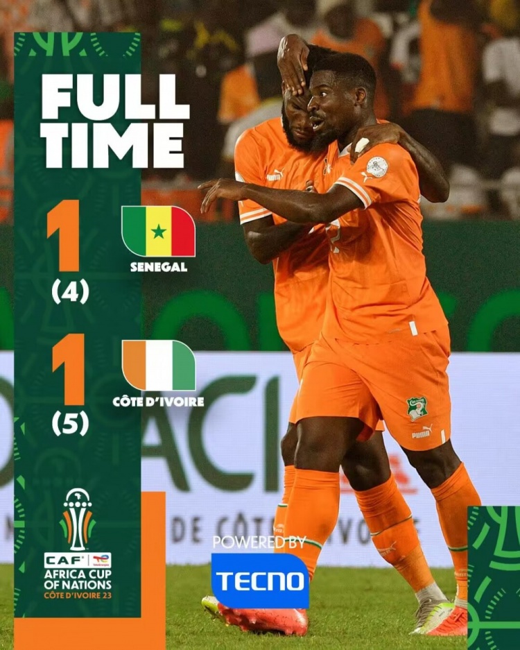 全场比赛结束,两队120分钟战成1-1,点球大战,科特迪瓦5-4塞内加尔。最终科特迪瓦总比分6-5淘汰塞内加尔。