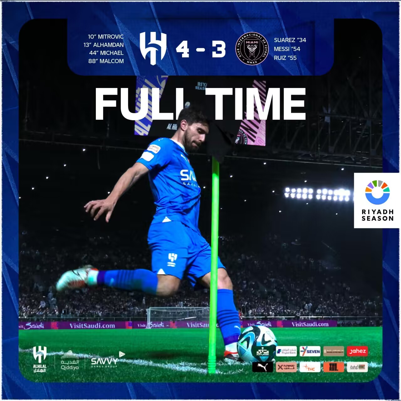 最终,利雅得新月4-3迈阿密国际。