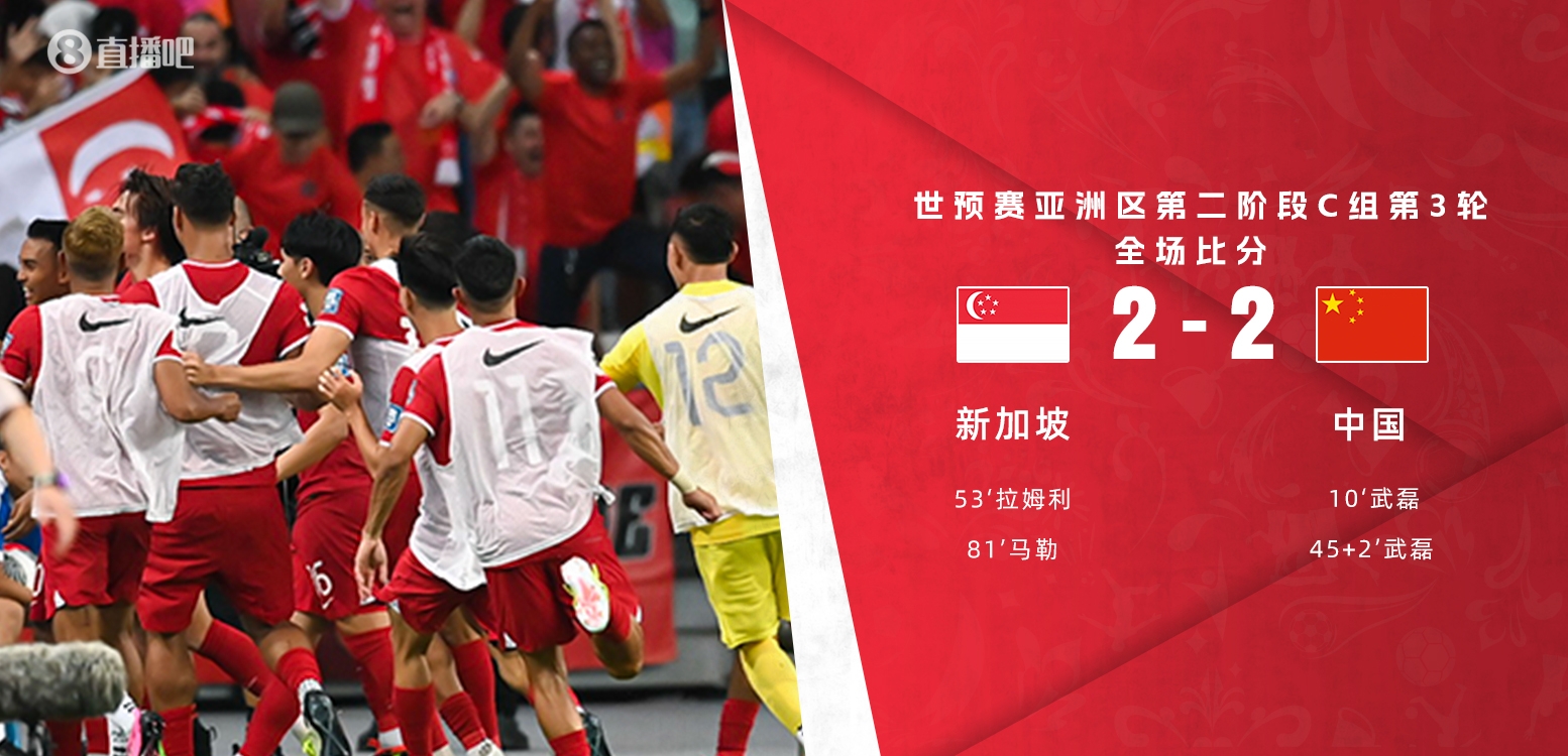 3月21日讯 北京时间3月21日晚20时30分,世预赛亚洲区第二阶段C组第3轮展开角逐,中国男足客场挑战新加坡。上半场武磊梅开二度&失点,张玉宁停球失误失单刀,费南多边路无解突破屡造威胁,下半场新加坡连扳两球,张玉宁伤退。最终中国男足客场痛失好局2-2战平新加坡,伊万科维奇无缘执教国足首胜,双方将于3月26日移师天津进行第4轮较量。C组积分榜方面,国足积4分位居第3,新加坡积1分垫底。