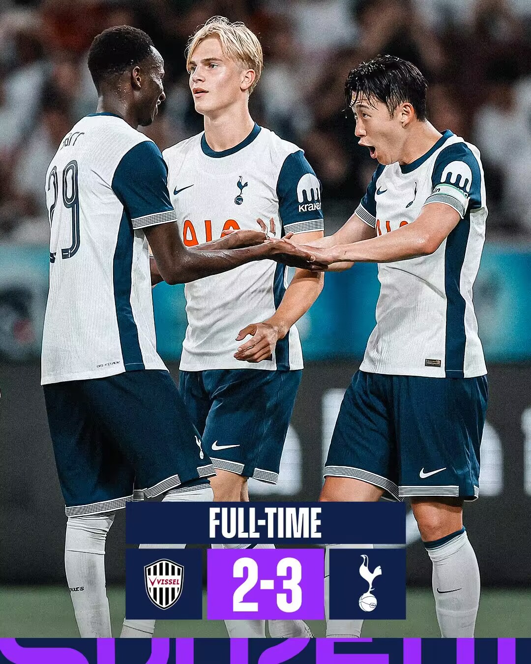 伤停补时3分钟。全场比赛结束,热刺3-2神户胜利船。