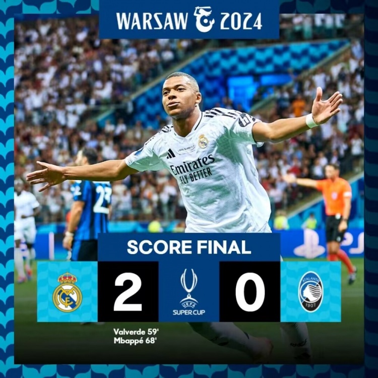 姆巴佩首秀破门!皇马2-0亚特兰大夺欧超杯 6次夺冠创赛事纪录