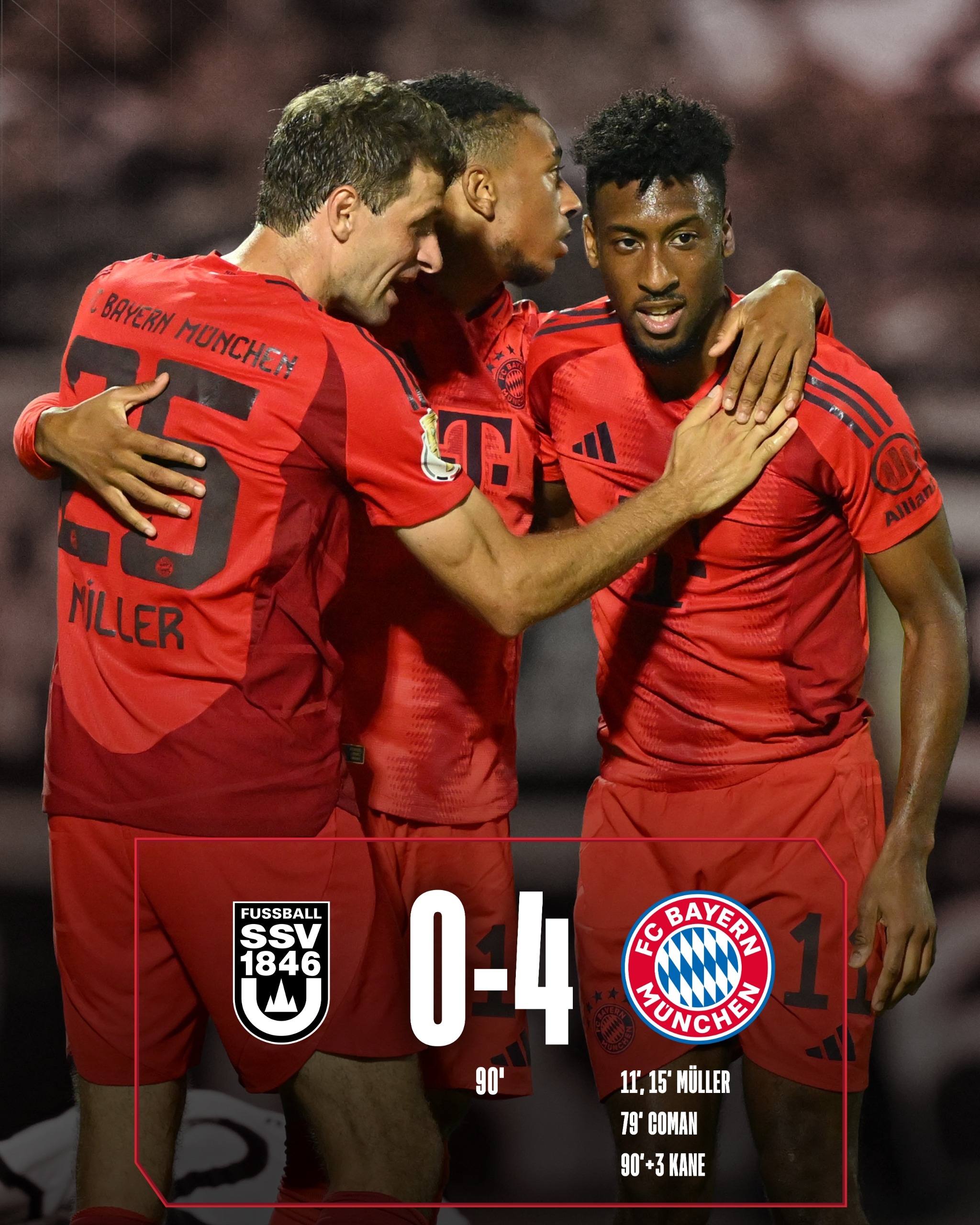第93分钟,拜仁杀死比赛!穆勒右路传到禁区凯恩门前头球破门,乌尔姆0-4拜仁。↓