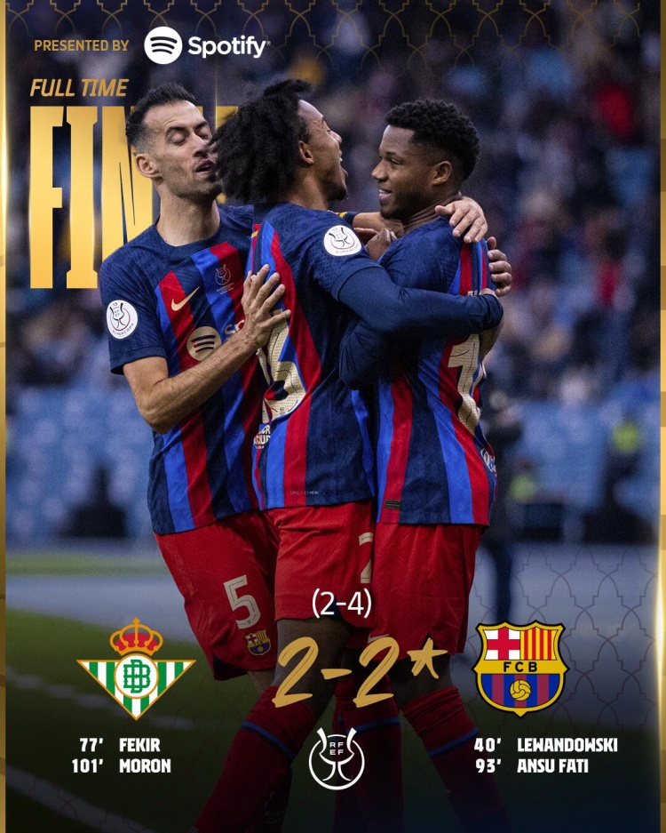 1月13日讯北京时间1月13日凌晨3:00,西班牙超级杯半决赛,皇家贝蒂斯对阵巴塞罗那。上半场,佩德里进球被吹,登贝莱助攻莱万破门为巴萨取得领先,特尔施特根屡献扑救;下半场,费基尔抽射破门扳平比分,莱万进球被吹,常规时间双方战成1-1。加时赛,法蒂抽射破门,随后莫隆进球再次扳平比分!双方进入点球大战,巴萨四罚全中,特尔施特根扑出卡瓦略和胡安米的点球!全场比赛结束,巴萨6-4皇家贝蒂斯晋级决赛,他们将在决赛中面对皇马!