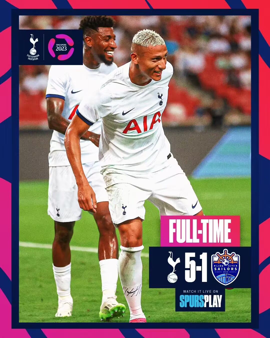 伤停补时4分钟。全场比赛结束,热刺5-1狮城水手。