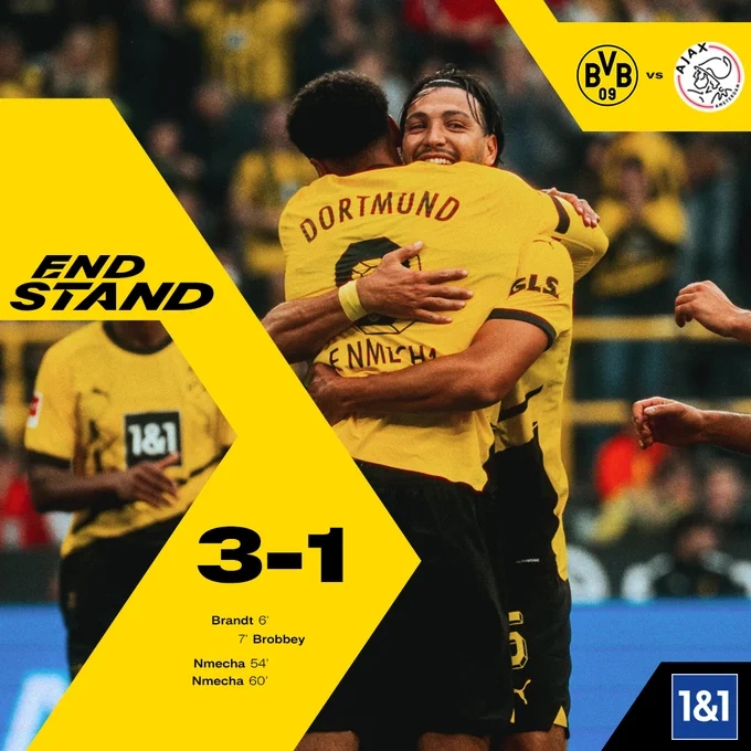 8月7日讯 足球友谊赛,多特对阵阿贾克斯。上半场,布兰特破门,布罗比扳平;下半场,恩梅查连入两球。最终,多特3-1击败阿贾克斯。