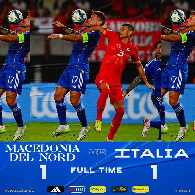下半场伤停补时6分钟,全场比赛结束,最终意大利1-1北马其顿。