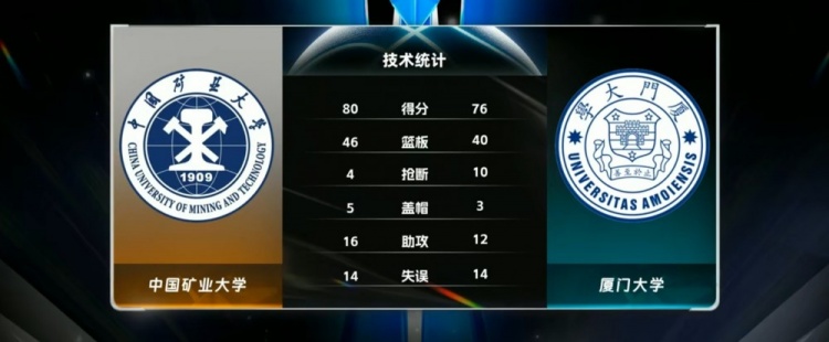 末节决战,李昕哲稳定输出帮助中国矿大再度获得10分以上领先,郑博文挺身而出连续打成2+1迫近比分,双方围绕10分左右分差展开激烈争夺,厦门大学内外开花连得5分,郑博文上篮也有,最终,中国矿大80-76力克厦门大学。