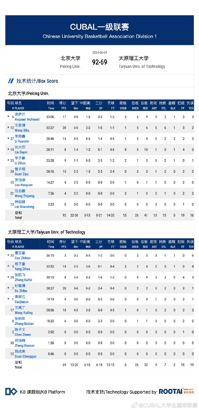 6月9日讯 CUBAL全国八强赛首回合,北京大学主场迎战太原理工大学。