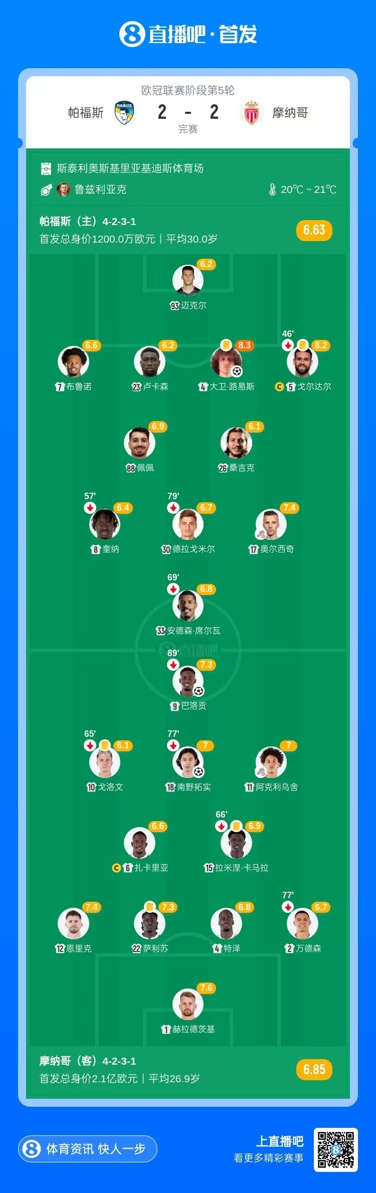 遭绝平!摩纳哥2-2帕福斯 38岁大卫·路易斯破门南野拓实建功