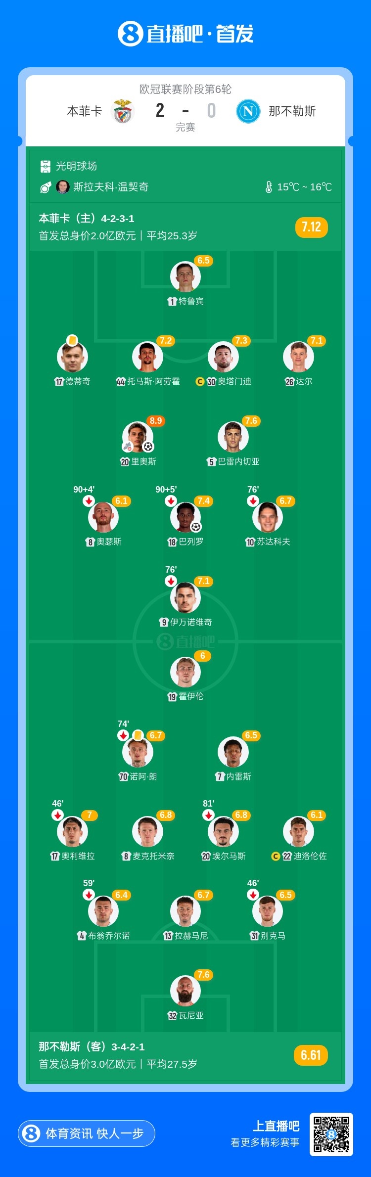 第49分钟,里奥斯右路大空挡下底,皮球横扫小禁区,巴列罗精彩脚后跟破门!本菲卡2-0领先那不勒斯↓